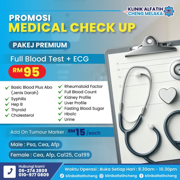 搜索关键词 health screening Malaysia, blood test clinic, affordable health check, Klinik Al Fatih Cheng, medical checkup Melaka, preventive healthcare, early disease detection, comprehensive health package, family health screening, annual health checkup优势 Comprehensive health checks,Affordable prices,Early disease detection,Prevention and appropriate treatment planning,Reduced treatment costs