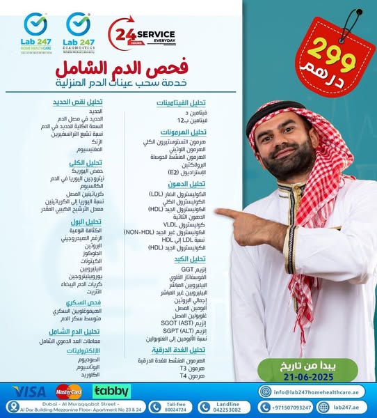 搜索关键词 comprehensive blood test, home blood test, UAE health checkup, affordable medical tests, lab247 home healthcare, dubai health screening, sharjah medical test, preventive health, vitamin d test, blood test package优势 Comprehensive testing panel,Convenient home blood sample collection,Affordable price (299 AED),Wide range of tests included