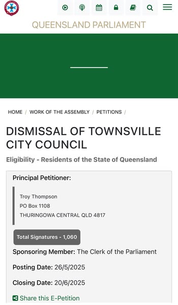 DISMISS TOWNSVILLE CITY COUNCIL PETITION