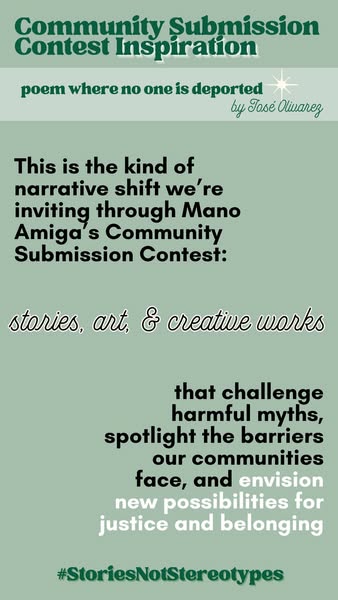 搜索关键词 immigrant stories, social justice, Mano Amiga, immigration reform, family separation, working families, poem contest, stories not stereotypes, challenge flawed system, immigration issues优势 Highlights immigrant struggles,Promotes social change,Encourages storytelling