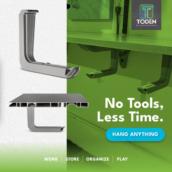 The Toden storage hook allows you to "hang everything," from ladders to extension cords, chains to skates, life jackets to chainsaws - and even a helmet. With limitless configurations across Toden's surface channels, you can maximize your hanging space at home or work. Never before has there been an organization and storage hook that installs without tools and holds so much weight without sagging or breaking.