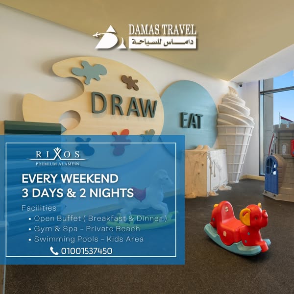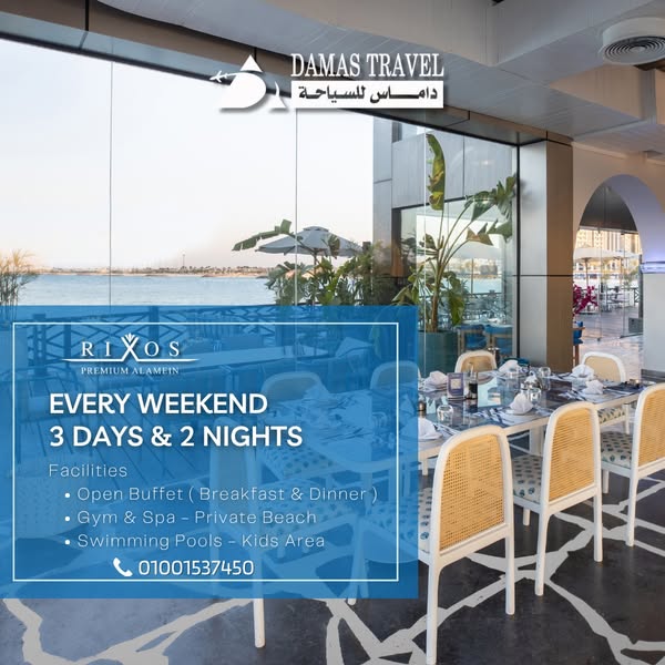 搜索关键词 Rixos Alamein, Summer Vacation, Egypt Travel, Luxury Hotel, Weekend Getaway, Damas Travel, North Coast Egypt, Premium Hotel, Open Buffet, Sea View Hotel优势 5-Star Hotel Stay,Sea View,Premium Service,Open Buffet Breakfast & Dinner Included,Luxury Vibes and Relaxation
