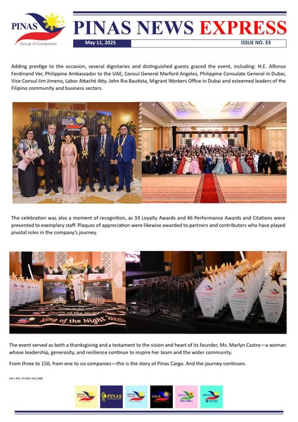 搜索关键词 Pinas Cargo Services, Filipino Community UAE, Cargo to Philippines, International Shipping Dubai, Marlyn Castro Leadership, Pinas Group Companies, Remittance Services Dubai, Filipino Workers Support, Overseas Filipino Workers, Affordable Cargo Philippines优势 Growth and Expansion,Employee Appreciation,Community Support (Scholarships),Strong Leadership,Loyalty and Performance Recognition