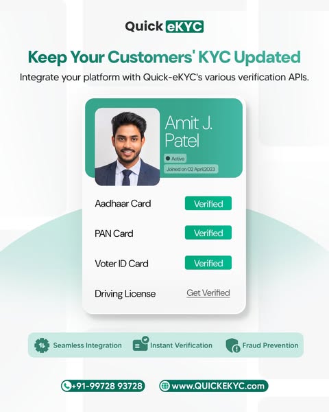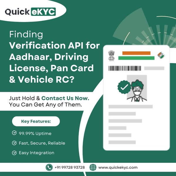 💥 Tired of Fake Signups, Payout Fraud & Delayed KYC? If you’re running a loan app, wallet, fantasy game, EV onboarding system or UPI payout platform — you already know that bad KYC = bad business. With QuickeKYC, verify your users in real-time using enterprise-grade APIs that power India’s fastest-growing apps. 🔐 Our API Suite Includes: ✅ Aadhaar Verification (via VID or QR) ✅ PAN Validation (Direct NSDL Lookup) ✅ Bank & UPI Account Name Match ✅ GST & Voter ID for SME & customer onboarding ✅ RC & DL Check via VAHAN ✅ AML Risk Score, OCR & Liveness Detection 🎯 Why Teams Choose Us: Real-time data with <2 sec API response Token-authenticated secure access Developer-first API setup: Docs + Postman + sample code 24x7 uptime and support Full KYC/AML compliance as per RBI, SEBI, UIDAI 🛡️ No fake trials. No dummy access. Only real B2B onboarding. Perfect for: Loan Apps | UPI Payout Portals | NBFCs | Gaming | EV | Solar Fintech | Driver Platforms 📞 Talk to us: +91-99728 93728 🌐 Visit: