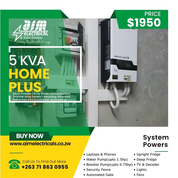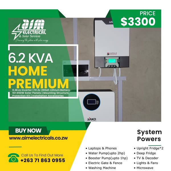 Choose from 1kVA to 6.2kVA solar packages – perfect for everything from phone charging to running your fridge, TV, borehole pump, and more.