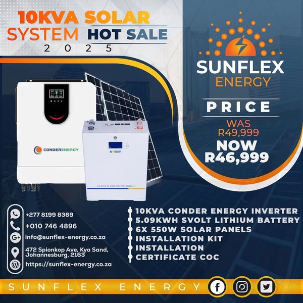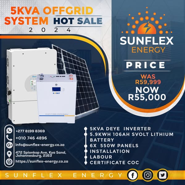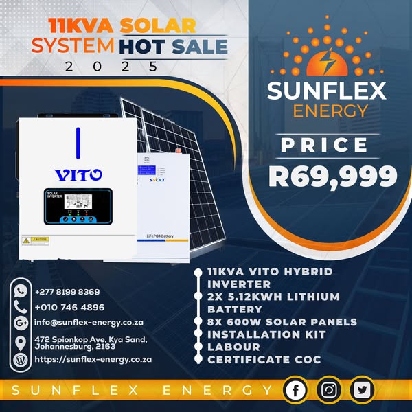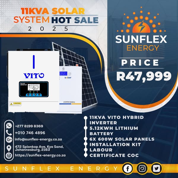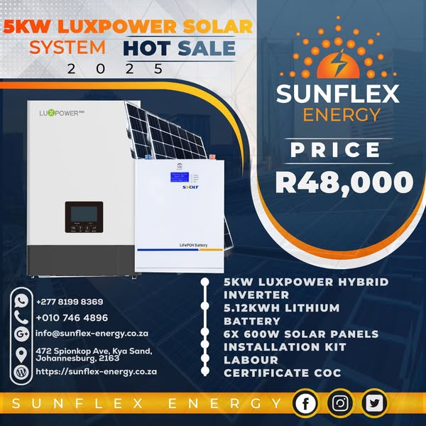Loadshedding is back. Get yourself a solar system today at a reasonable price with Sunflex Solar Energy. Kindly whatsApp us on 078 199 8369 for a free quote.