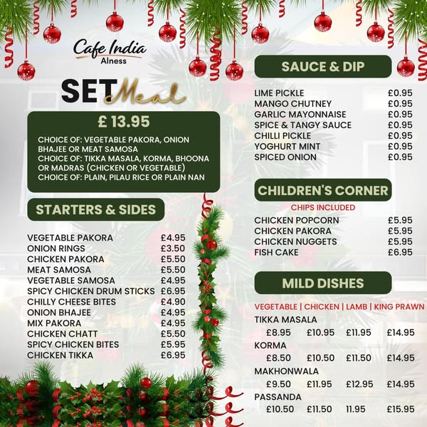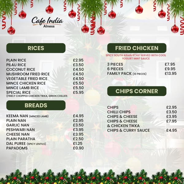 搜索关键词 Christmas takeaway Alness, Cafe India Christmas, Festive food Alness, Indian takeaway Christmas, Alness Christmas dinner, Christmas Day Food, Holiday takeaway menu, Alness restaurant takeaway, Christmas eve takeaway, Best Christmas takeaway优势 Delicious festive flavors,Convenient takeaway option,Easy pre-order system