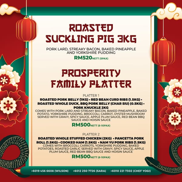 𝐑𝐨𝐜𝐤𝐚𝐟𝐞𝐥𝐥𝐞𝐫𝐬' 𝐂𝐡𝐢𝐧𝐞𝐬𝐞 𝐍𝐞𝐰 𝐘𝐞𝐚𝐫 𝐏𝐫𝐨𝐬𝐩𝐞𝐫𝐢𝐭𝐲 𝐓𝐚𝐤𝐞𝐚𝐰𝐚𝐲 𝐌𝐞𝐧𝐮 is here to elevate your celebrations. Indulge in a mouth-watering spread of roasted meats, highlighted by the show-stopping Roasted Suckling Pig and the bountiful 𝐏𝐫𝐨𝐬𝐩𝐞𝐫𝐢𝐭𝐲 𝐅𝐚𝐦𝐢𝐥𝐲 𝐏𝐥𝐚𝐭𝐭𝐞𝐫.
