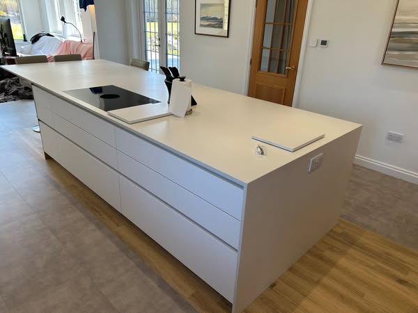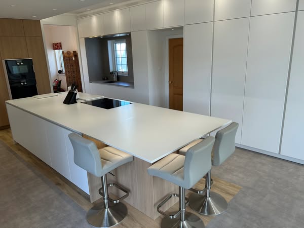 搜索关键词 bespoke kitchen design, high-end kitchen, modern kitchen ideas, luxury kitchen remodel, drumoak kitchens scotland, handleless kitchen cabinets, bora induction cooktop, quooker boiling tap, kitchen island design, family kitchen area优势 Handleless aesthetic,High-end appliances (Bora, Quooker),Custom-crafted ceiling feature,Concealed butler's pantry and bar,Dedicated family area,Ample storage solutions