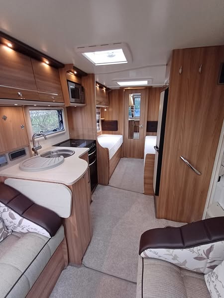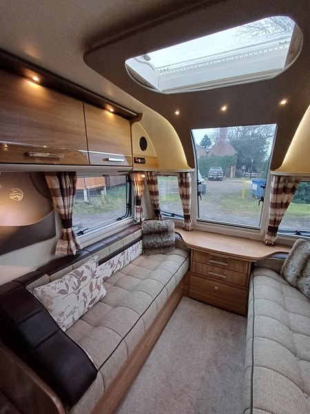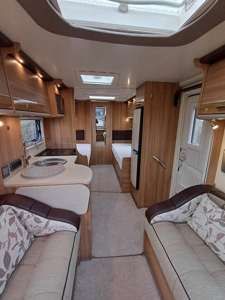 Absolutely luxurious Caravan with upgraded Trafalgar Upholstery that really is something special. With 2 single Fixed Beds, end bathroom and a living room area that turns into a large double bed. It's built with an alu-tech body meaning its really lite to tow and really well insulated so its super warm, it also means theres no timber in the roof or walls so it doesnt get the usual damp problems. It has Alde central heating and beautiful high end fixtures and fittings making this holiday home feel stylish but very comfortable and plush. It has an auto Engage Motor Mover making it a doddle to get onto pitch or onto the drive at home and also a Solar Panel to keep your battery topped up when you go off grid. This caravan really has the WOW factor !