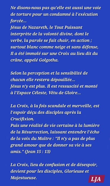 Puissions nous aussi comprendre qu'au coeur de la foi chrétienne, la Croix est une série d'épreuves visant à activer et recevoir toutes les grâces qui accompagnent ce mystère déjà élucidé par le Christ !