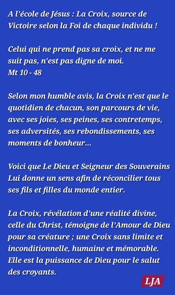 A l'école de Jésus : La Croix, source de Victoire selon la Foi de chaque individu !