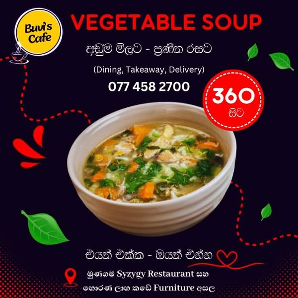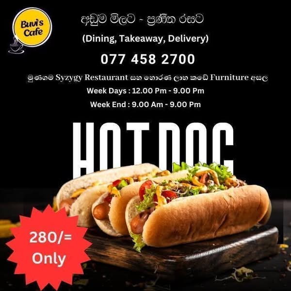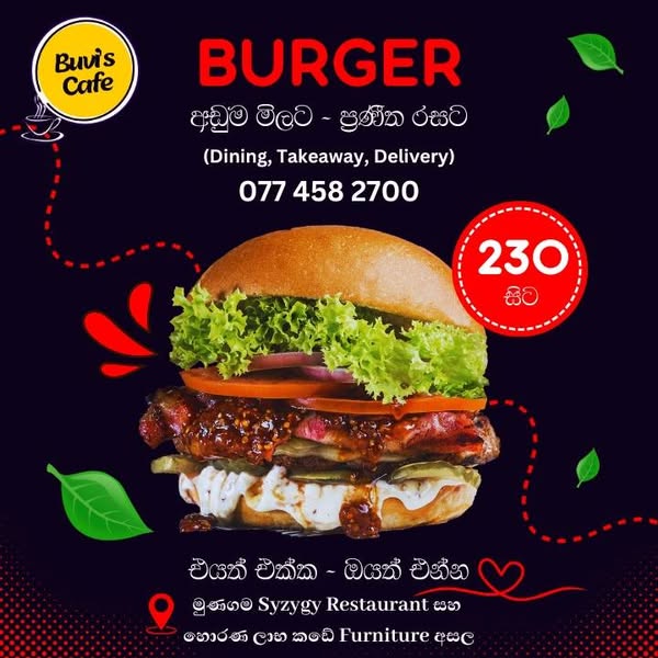 搜索关键词 buvi's cafe, horana delivery, healthy food, sri lanka food, short eats, burger shawarma, open public holidays, customer feedback, affordable food, freshly prepared优势 Wide variety of food options (110+),Freshly prepared food after order,Delivery available in Horana area,Open on public holidays,Customer feedback is valued,Affordable prices (starting from Rs.30)