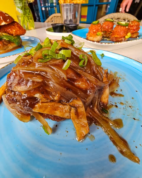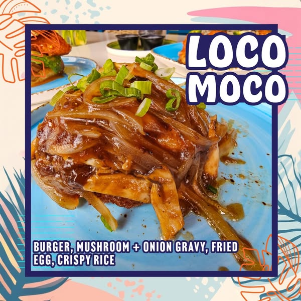 🍳 Loco Moco – Burger, Mushroom + Onion Gravy, Crispy Rice.