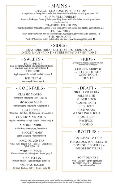 Steaks, chops, ahi tuna, fish, shrimp, burgers, wings, Reuben, Cuban, salads.. 🤤