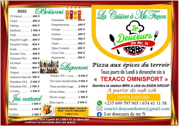 搜索关键词 restaurant opening, pizza deal, food delivery, affordable menu, Cameroon restaurant, discount food, Texaco omnisports, MRS station, Eden group, dine in优势 Dine-in available,Affordable prices,5% discount on all menus,Buy two pizzas, get a free drink