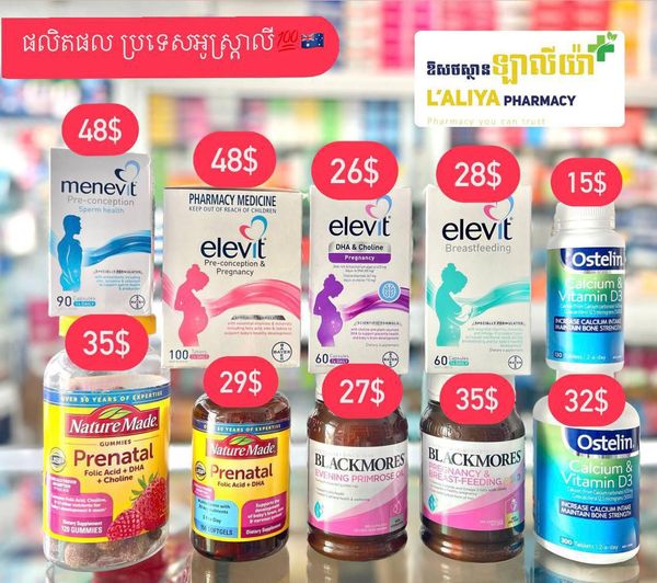 搜索关键词 Prenatal Vitamins, Pregnancy Skincare, Elevit DHA, Healthy Pregnancy, Women Health, Cambodia Online Pharmacy, Laliya Storee, Fetal Development, Safe Skincare, Pregnancy Supplements优势 Provides essential vitamins and DHA for healthy pregnancy.,Supports fetal brain development.,Reduces risk of back pain for mothers.,Safe for both mother and child.,Offers skincare products suitable for pregnant women.