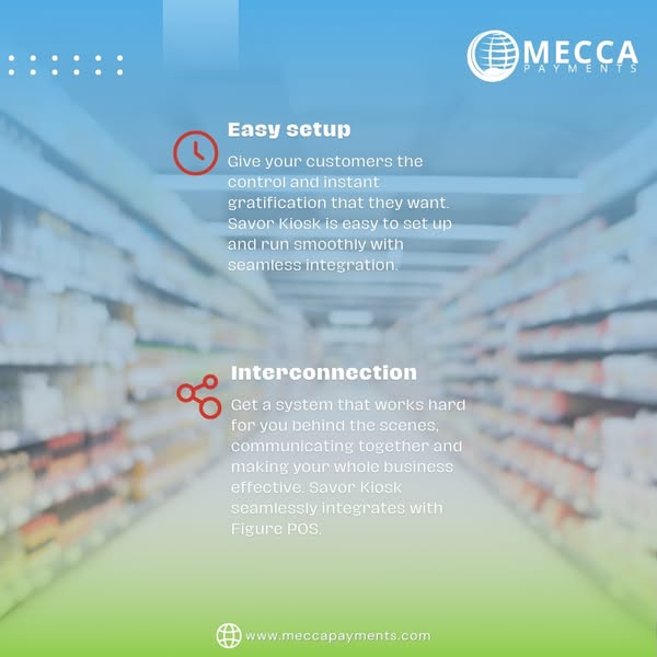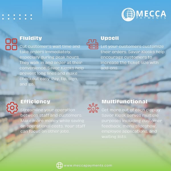 搜索关键词 restaurant kiosk, self serve, point of sale, increase sales, reduce wait, easy setup, seamless integration, mecca payments, business efficiency, payment solutions优势 Reduces wait times,Increases upsells,Easy setup,Seamless integration,Total efficiency
