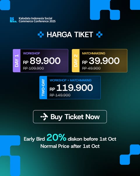 Bergabunglah dengan kami pada 15-16 Oktober 2025 untuk event social commerce terbesar di Indonesia! Dimeriahkan oleh TOP Sellers, kreator, dan agensi, acara ini akan menjadi panggung global yang tak terlupakan! ✨ Didukung oleh SMESCO ✨ TOP Influencer: Baim Wong & Ruben Onsu ✨ Edukator Lokal dan Internasional: Coach Aziz MK dari Malaysia dan pembicara hebat lainnya dari Indonesia. ✨ Sharing dari Merek Terkenal: Unilever, L'Oréal, Reckitt, dan Cussons. 🚀 Matchmaking Terbesar di Indonesia: Dihadiri lebih dari 300 TOP Sellers, 10 Leading Agencies, dan 2000+ TOP Creators dengan model bisnis baru: “LIVE Broadcast + Real-time Connection”! 🏆 Penghargaan Tahunan Kalo Awards: Brand Awards: Best of the Year, Fastest Growing, Outstanding Global Brand. Individual Awards: TikTok Celebrity of the Year, Influencer of the Year, Education Expert. Agency Awards: Best MCN, TSP, dan TAP service agency of the year. 🛒 Beli tiket di sini: