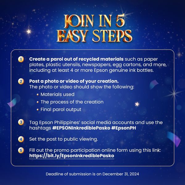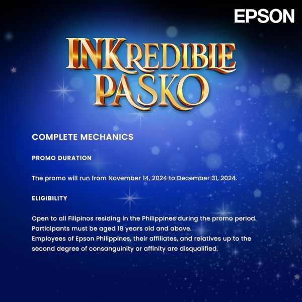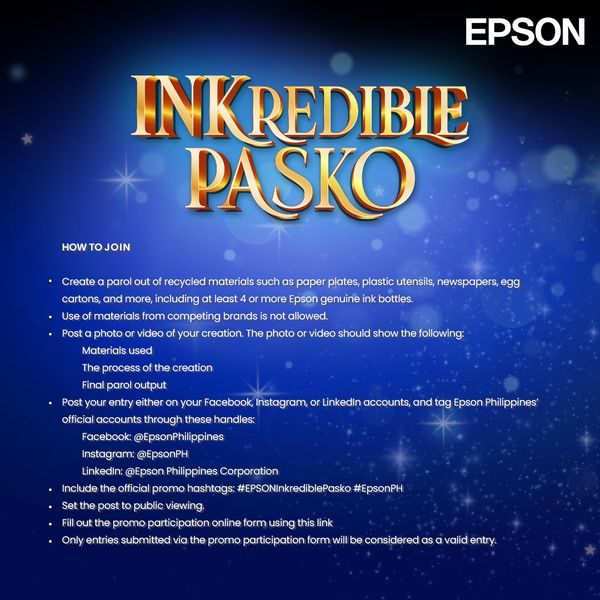 ⭐ Tag Epson Philippines' social media accounts and use the hashtags #EPSONInkrediblePasko #EpsonPH