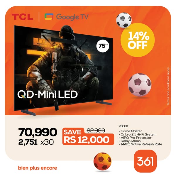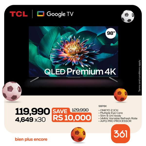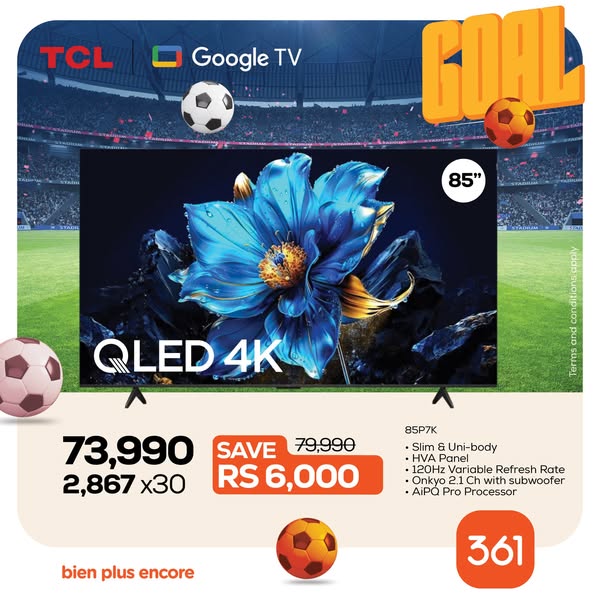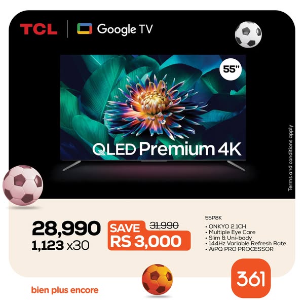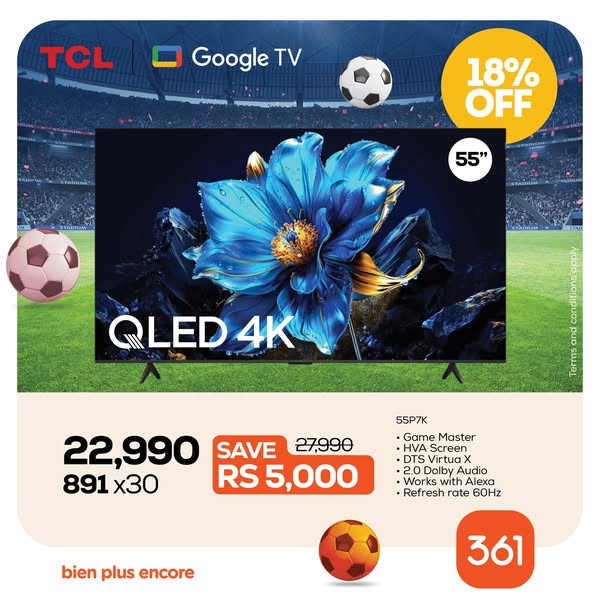 搜索关键词 TCL TVs Mauritius, 361 Electronics, TV Credit Options, Home Entertainment, Stadium Experience TV, Zero Interest Finance, Television Sale, Smart TV Deals, 4K TV Price, Best TV Offers Mauritius优势 Stadium-like viewing experience,Multiple credit options available,Zero interest financing (361 Credit),Available online and in showrooms