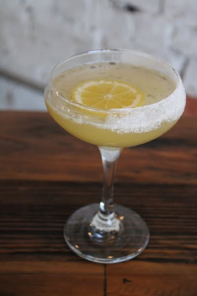 Vodka, lemon juice, and lavender honey syrup with a sugar rim.