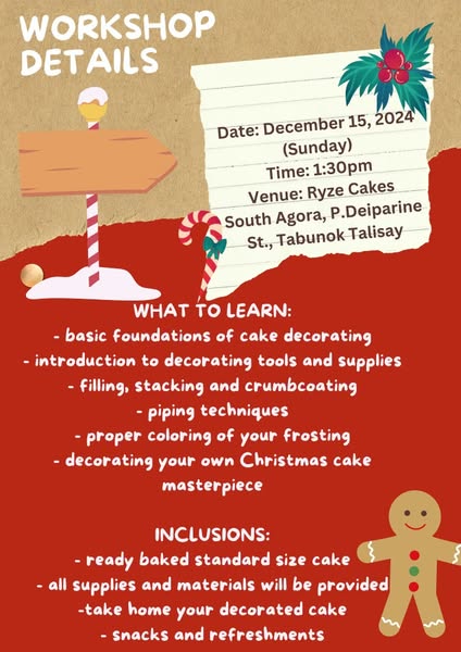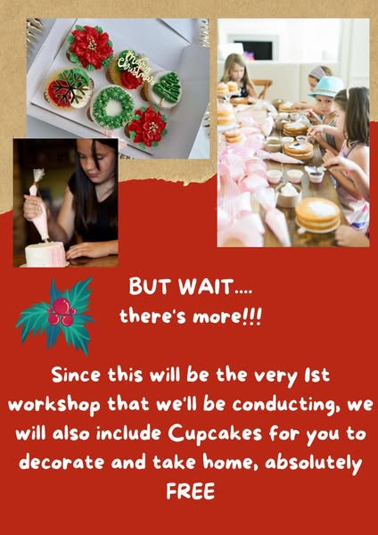 搜索关键词 Christmas cake decorating, holiday baking class, cake art techniques, festive cake design, cupcake decorating, Ryze Cakes workshop, learn to decorate cakes, baking skills, icing and piping techniques, christmas crafts优势 Learn basic icing and piping techniques,All materials provided,Snacks and refreshments included,Free cupcake decoration