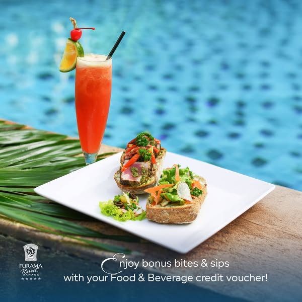 (*) Terms & Conditions: Guests can use the voucher for all F&B services within the resort. If spending exceeds the voucher value, guests will pay the difference. In case the voucher value is not fully used, the remaining balance will not be refunded.