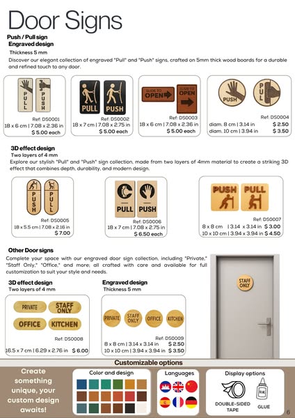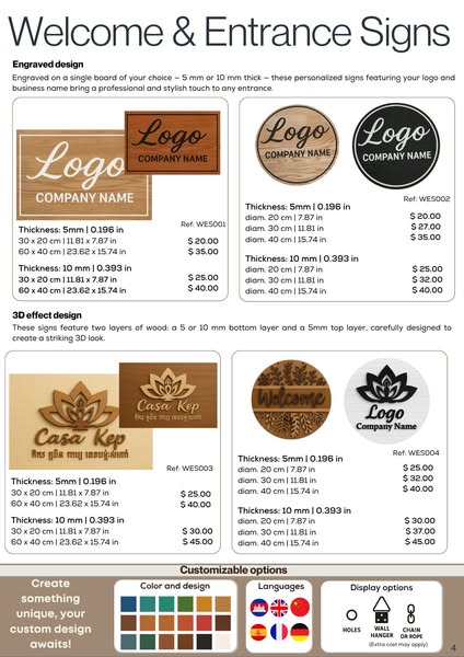 កំពុងស្វែងរកស្លាកបិទផ្ទាំងឈើដែលមានស្ទីលនិងអត្តសញ្ញាណមែនទេ? សូមស្វែងរក សៀវភៅកាតាឡុកស្លាកឈើ ថ្មីរបស់យើង – មានការរចនាឡាស៊ែរ ងាយស្រួលប្តូរតាមតម្រូវការសម្រាប់សណ្ឋាគារ ភោជនីយដ្ឋាន ហាង ល្ខោនស្បែក និងអាជីវកម្មផ្សេងៗទៀត។