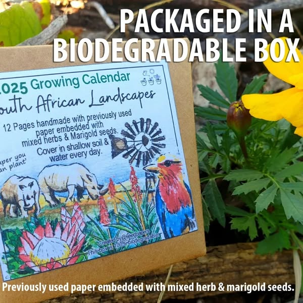 搜索关键词 eco friendly gifts, growing calendar, seed paper calendar, South African landscape, corporate gifts, sustainable gift ideas, local handmade gifts, biodegradable gifts, Christmas gifts, end year gifts优势 Eco-friendly and sustainable,Contains embedded seeds for growing herbs and flowers,Supports local South African artists,Comes with a reusable wooden stand,Biodegradable packaging,Suitable for various occasions: gifts, stocking fillers