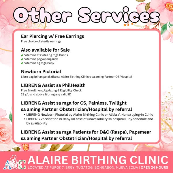 搜索关键词 free normal delivery, philhealth maternity, birthing clinic bongabon, prenatal care rewards, alaire birthing clinic, 24/7 birthing, maternity assistance, affordable birth, safe delivery, mom and baby care优势 Free normal delivery with PhilHealth,Free check-ups for pregnant women (even without PhilHealth),Free PhilHealth assistance (enrollment, updating, eligibility check),Free Implant/PPIUD insertion with PhilHealth,24/7 service,Prenatal care rewards