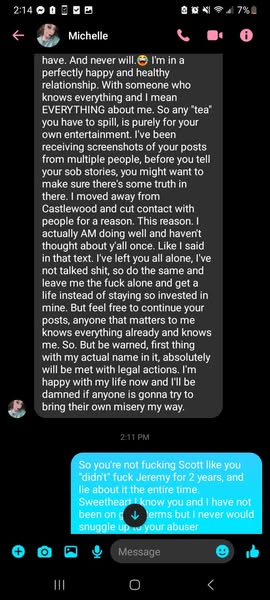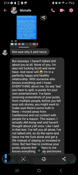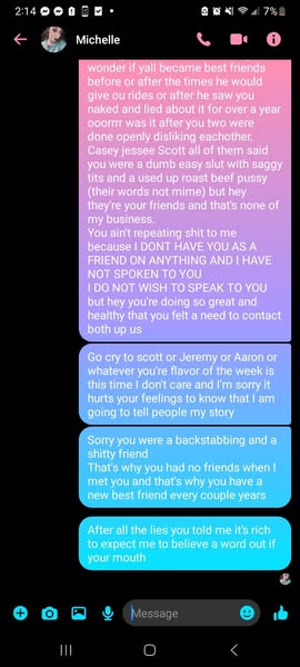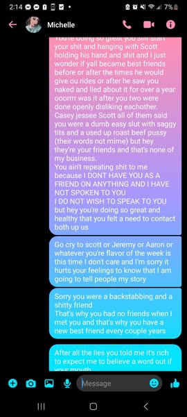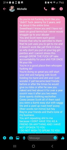 She's sending voice messages now and threatened "legal action". I said all I needed to say and am blocking her so she can continue to be in such a good place. Keep in mind this is why I'm deleting people she's so unbothered she had to reach out to 2 of us despite being blocked on most things :)