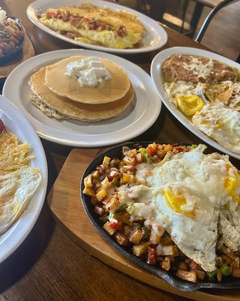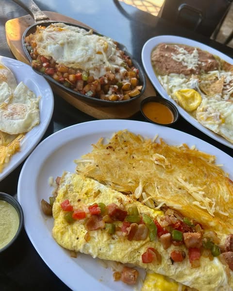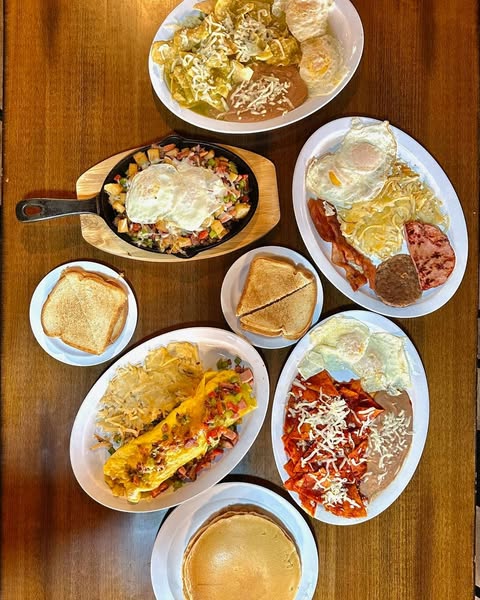 🎉 Hey, let’s heat up your weekend with a killer Mexican breakfast! 🍳🔥 Dig into Chilaquiles Verdes soaked in that tangy green salsa 🌶️🥙, a Meat Lovers Omelette stuffed with sausage, ham, and bacon 🥓🍳🧀, and the Southwest Skillet jam-packed with all the good flavors 🌯🌶️!