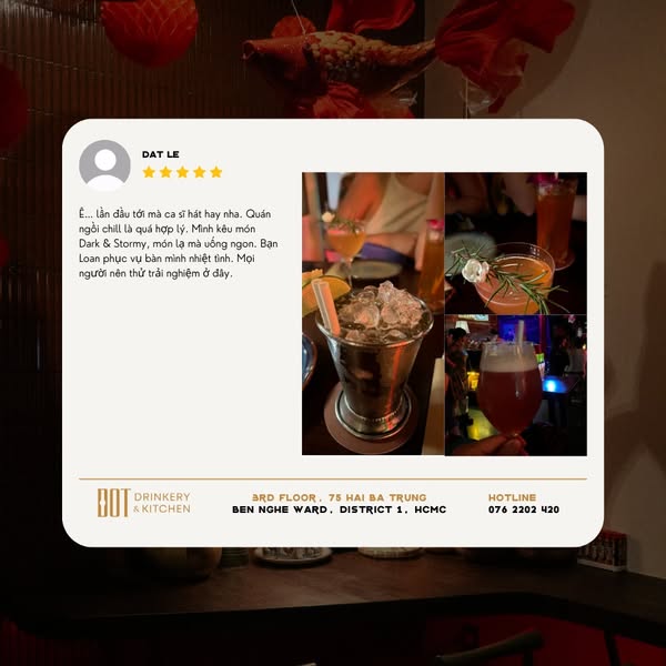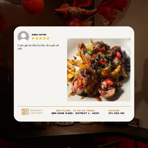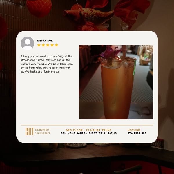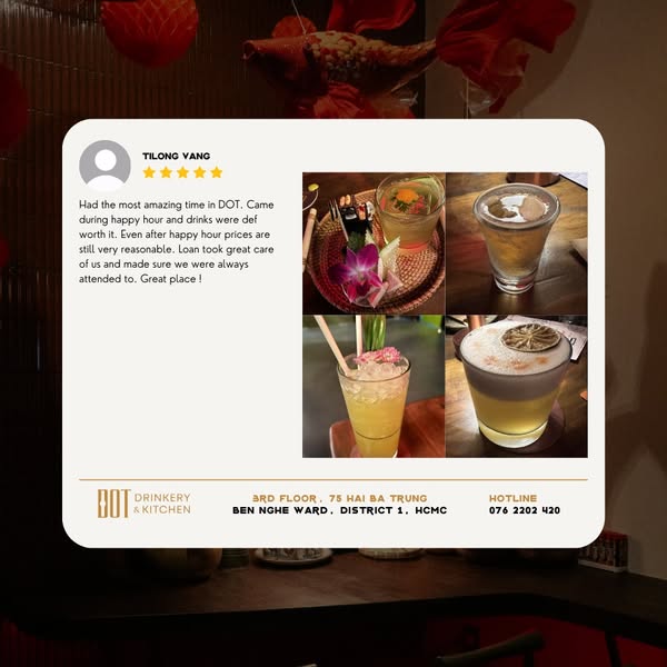 搜索关键词 DOT Bar Saigon, Cocktail Bar, Saigon Nightlife, District 1 Bar, Best Bars Vietnam, Happy Hour Saigon, Signature Cocktails, Datingspot Saigon, Bar of the Year, Vietnamese Bar优势 Positive customer reviews,Award-winning (BAR OF THE YEAR 2022),Happy Hour deals,Prime location in District 1, HCMC