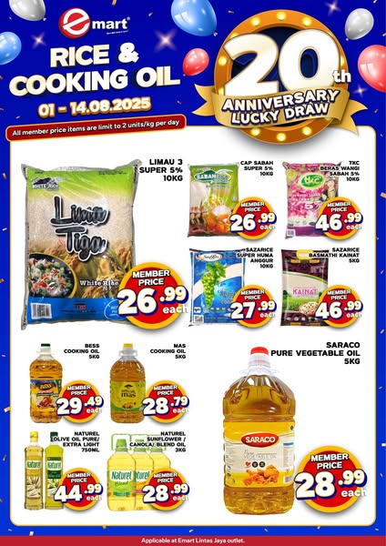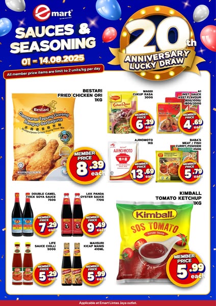 搜索关键词 Emart Sabah, Anniversary Deals, Lucky Draw, Malaysia Supermarket, Grocery Shopping, Household Essentials, 24 Hours Store, Lintas Jaya, Big Savings, Win Prizes优势 Wide range of products,Amazing deals and discounts,Lucky draw with potential to win big,24-hour availability at Emart Lintas Jaya