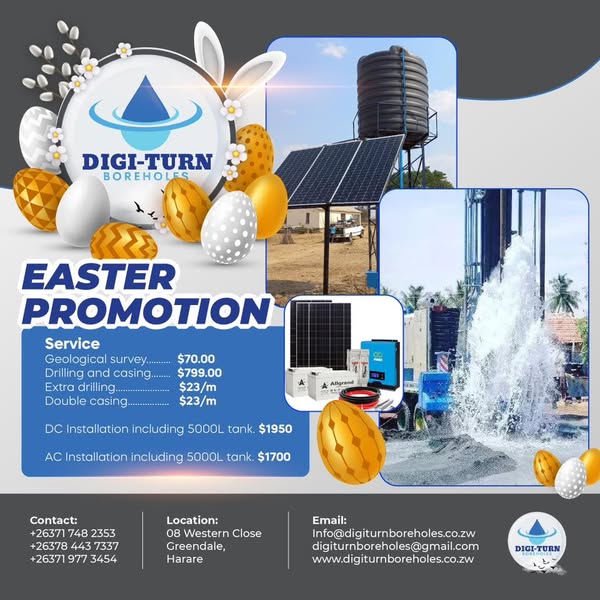 #DigiturnBoreholes #EasterPromo #BoreholeDrillingZimbabwe #HarareBoreholes #WaterSolutionsZW #BoreholeInstallation #ReliableWaterSupply #BoreholeExperts #CleanWaterZW #ACandDCPumps