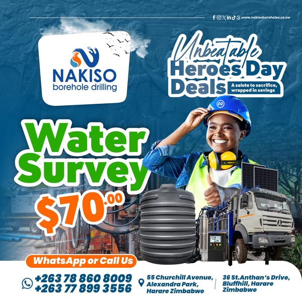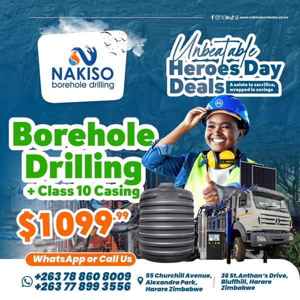 搜索关键词 Nakiso Borehole Drilling, Zimbabwe Water Solutions, Reliable Borehole Service, Heroes Day Water Deal, Borehole Drilling Harare, Trusted Drilling Company, Water for Farm, Water for Business, Community Water Supply, Drilling Services Zimbabwe优势 Trusted and reliable service,Delivers water to various needs,Heroes Day special deal