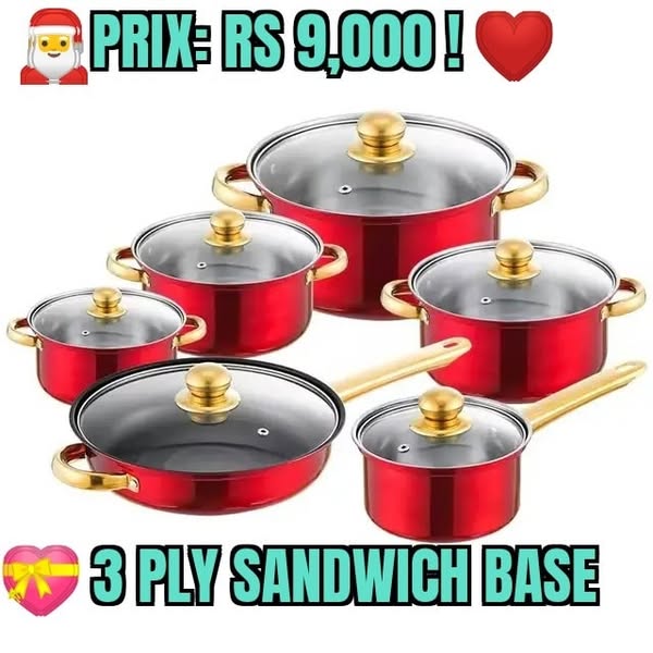🎀 Cette batterie de cuisine est fabriquée à partir d'inox chirurgicale 18/10: le grade d'acier le plus cher au monde. Cette matière est extrêmement résistante à la corrosion, à la rouille et à l'usure et va durer des lustres. Elle est aussi 100% saine et NON TOXIQUE et ne se décolore pas comme les ustensiles en aluminium bon marché. Ils sont tous livrés avec un couvercle en verre fumé résistant à la chaleur et les poignées ainsi que les manches sont aussi en inox chirurgicale de grade 18/10, ce qui vous permet de les utiliser au four sans problème. Les manches et les poignées sont plaqués or 24 carats pour apporter une touche d'élégance et de classe à votre cuisine ! ❤️ Les manches sont très solidement rivetés pour prolonger la durée de vie du produit. Le fond sandwich est composé de trois couches: chaque casserole renferme une feuille d'aluminium qui se trouve entre la base et la casserole pour absorber rapidement la chaleur uniformément et la répartir sur toute la surface afin de garantir une meilleure performance, ce qui vous permet de cuisiner sur feu doux et de faire un maximum d'économie de gaz et d'électricité ! ❤️ Tous ces éléments de cuisson fonctionnent parfaitement sur tous types de feux, dont l'induction et passent même au lave-vaisselle. Ils sont aussi très légers et se lavent facilement à la main. Les couvercles sont tous équipés d'un orifice qui laisse échapper la vapeur pour éviter les problèmes de débordements. Ces casseroles conviennent à toutes vos cuisson: rissoler, frire, sauter, mijoter, pocher, braiser, rôtir, saisir, bouillir, faire revenir, etc. C'est également le set de casserole 18/10 le plus abordable que vous pouvez trouver chez nous. Profitez-en. Nous sommes un magasin en ligne seulement et on peut livrer partout. Veuillez laisser votre numéro de téléphone pour commander ou appelez le service client 5887 4411.