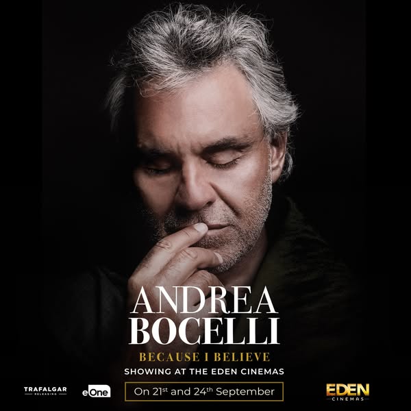 Tickets now on sale 🔥 Andrea Bocelli Because I Believe 🎬 Andrea Bocelli, the voice that touched millions, now tells his story like never before. Go beyond the stage and into the heart of a legend in this powerful, intimate documentary. 🎶 Experience the journey of one of the world’s greatest tenors, only at Eden Cinemas on 21st & 24th September. 🎟️ Get your tickets now: