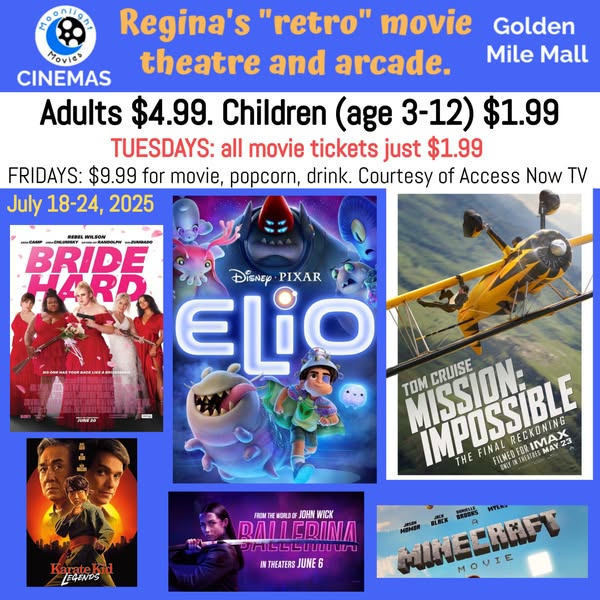 Affordable movies in the Regina area! Our indoor cinema at the Golden Mile Mall has some hot new (to us) titles starting this weekend. Maybe you skipped Elio at the chain theatres because were not sure if it was worth the big bucks? Well our tickets are only $4.99, children just $1.99. A lot easier to take the risk on a movie at those prices!