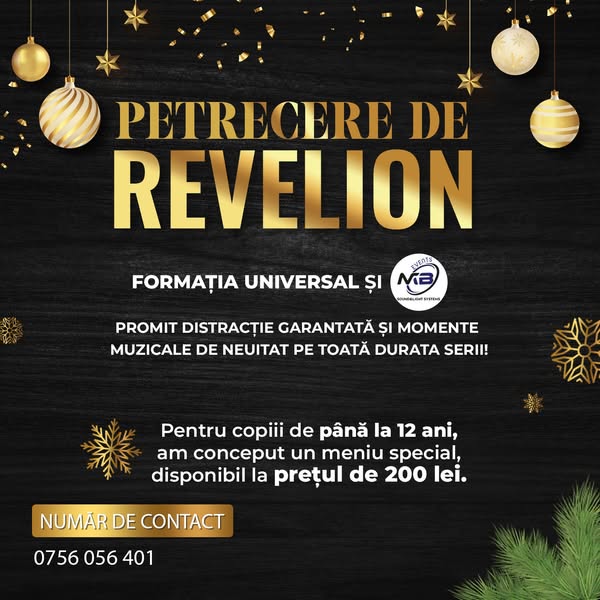 🎆 Vă invităm să sărbătoriți trecerea în Noul An într-un cadru distins, alături de muzică live oferită de Formația Universal și serviciile profesionale MB Events.