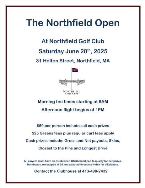 Saturday at the golf course we’re also hosting our classic Northfield Open tournament. At this time, we have two tee times available in the afternoon for anyone looking to participate ⛳️