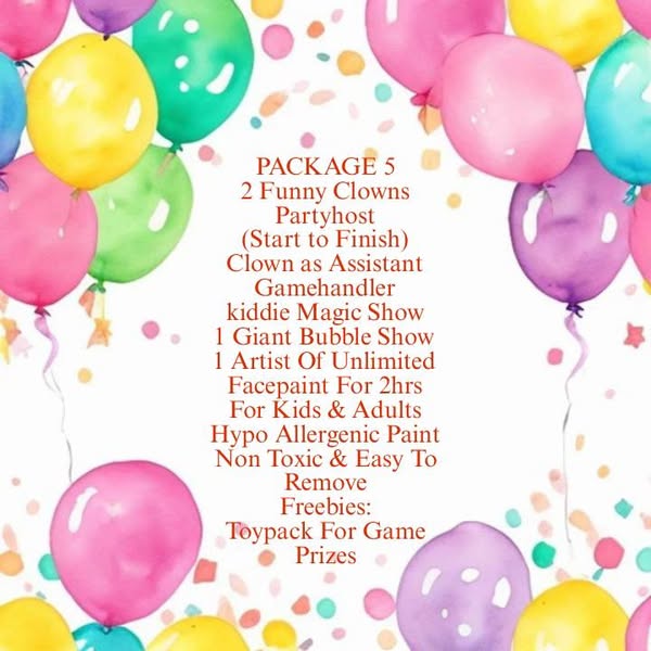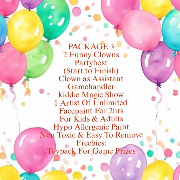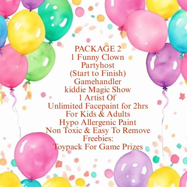 搜索关键词 kiddie party package, party entertainment services, clown for rent, party host, balloon decor, character mascot, puppet show, facepainting service, birthday party rentals, magician for hire优势 Wide range of entertainment options,No time limit of service,Advance booking accepted,Any location accepted