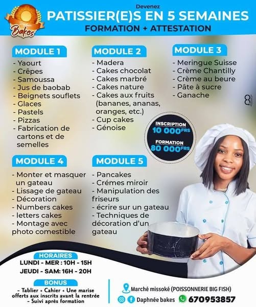 搜索关键词 pastry training, baking courses, Douala Cameroon, learn to bake, dessert recipes, cake decorating, pâtisserie skills, cooking classes, affordable training, vocational skills优势 Advanced and Express training options,Affordable price points,Learn from professionals,Friendly atmosphere,Develop real skills