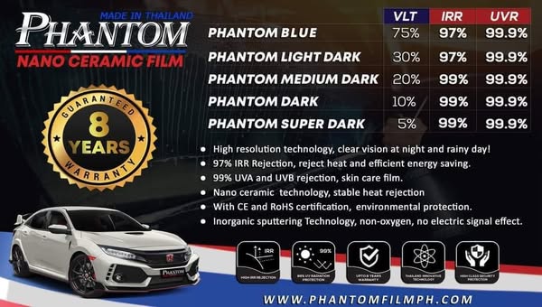 🚦"Phantom Nano Ceramic Tint is the ultimate solution for superior comfort and protection. Made in Thailand, it offers high heat rejection, anti-glare properties, 99% UV protection, and crystal-clear optical clarity. With true-rated specifications and no signal interference, it’s the affordable, high-performance choice trusted by the best in the market. Elevate your ride with Phantom, where quality meets value!"🚦