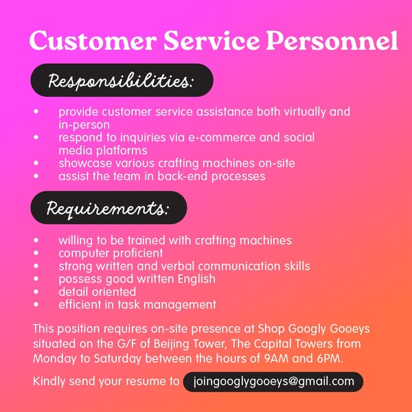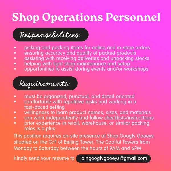 📍 This position requires on-site presence at Shop Googly Gooeys situated on the G/F of Beijing Tower, The Capital Towers from Monday to Saturday between the hours of 9AM and 6PM.
