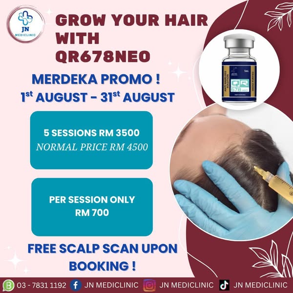 搜索关键词 hair loss treatment, hair regrowth, non surgical, female doctor, QR678 Neo, Selangor clinic, limited time offer, JN Mediclinic, hair thinning solution, stop hair fall优势 Clinically Proven,Non-Surgical,Stops Hair Fall,Reactivates Dormant Hair Follicles,Performed by Female Doctor,Safe,Effective