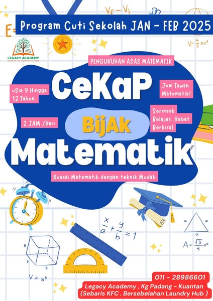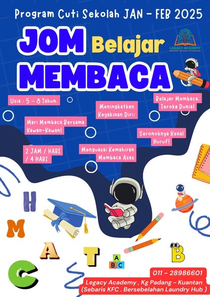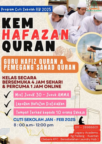 搜索关键词 school holiday programs, kuantan education, quran memorization, reading skills, math skills优势 Fun and beneficial learning experience for children.,Various program options catering to different age groups and interests.,Preparation for new school year and SPM exams.,Intensive Quran memorization program with qualified teachers.,Focus on creativity, hands-on activities, and public speaking.