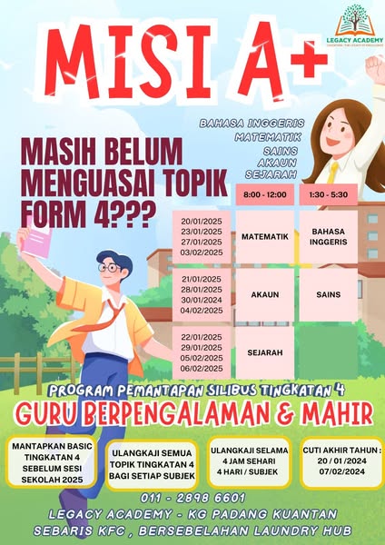Khusus kepada pelajar yang akan menduduki spm 2025 . Penekanan kepada subject2 tertentu bagi memantapkan penguasaan sebelum masuk tingkatan 5.
