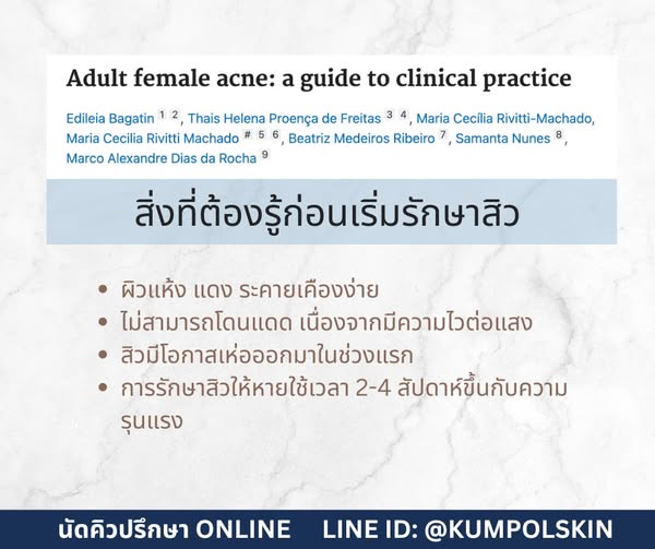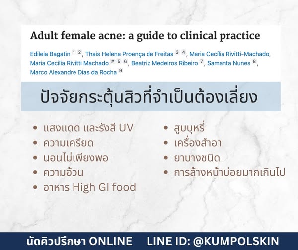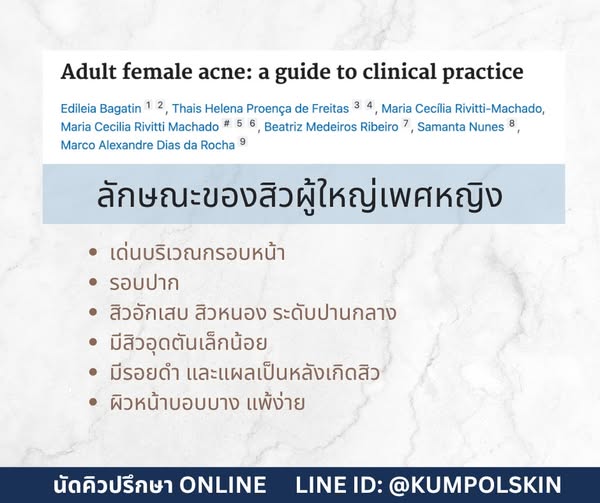 搜索关键词 adult female acne, acne treatment, online dermatology consultation, kumpol skin clinic, dermatologist bangkok, acne triggers, acne medication, skin clinic online, dermatological advice, acne treatment thailand优势 Focuses on adult female acne,Provides information on acne characteristics, triggers, and treatments,Offers online consultation,Referenced with a medical paper